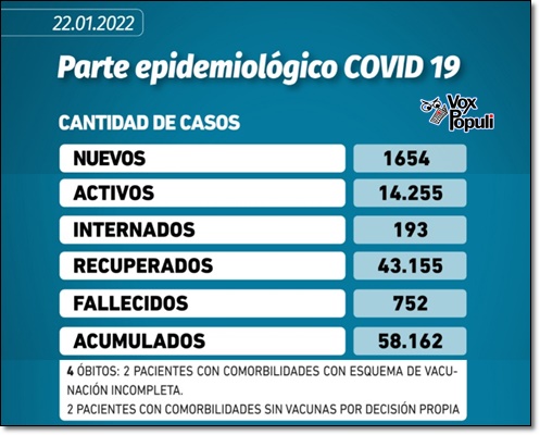 Enero, que comenzó con 189 casos suma 19.771 casos, 36 fallecidos (22 sin vacunar, y catorce con esquema de vacunación incompleto), 14.255 activos y 193 internados; personas aisladas preventivamente: sin datos