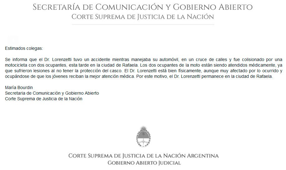 «El Dr. Lorenzetti está bien físicamente, aunque muy afectado por lo ocurrido y ocupándose de que los jóvenes reciban la mejor atención médica. Por este motivo, el Dr. Lorenzetti permanece en la ciudad de Rafaela», dijo en un comunicado María Bourdin, secretaria de comunicación de la Corte.